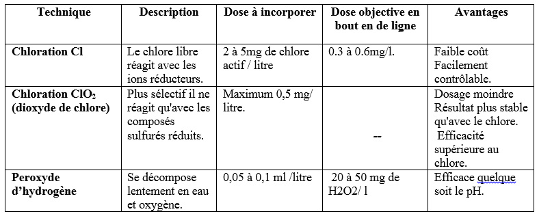 Le peroxyde d’hydrogène est pour sa part adapté aux eaux dures, au à pH élevé ou aux eaux ferrugineuses. Il est en revanche plus onéreux que la chloration et sa présence à des teneurs minimales de 30 ppm en bout de ligne nécessite d’être régulièrement contrôlée (test de type bandelette colorimétriques).