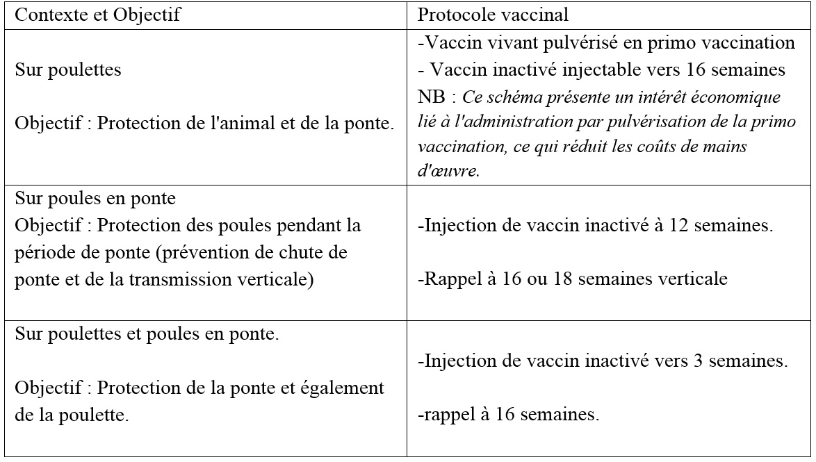• F-strain : Il s’agit de la souche la plus utilisée. Elle est peu virulente en poulet mais dangereuse pour les dindes et offre une meilleure protection que les autres souches vivantes. Elle est donc particulièrement destinée à la protection des poulettes avant l’entrée en ponte et à la réduction de la transmission verticale. Sa mise en œuvre est recommandée en application intra oculaire. La pulvérisation est possible Avantages : La virulence résiduelle de la souche permet une protection par diffusion au sein du lot et une colonisation du milieu par les souches vaccinales Inconvénients : Forte pathogénicité de la souche vis-à-vis des dindes.